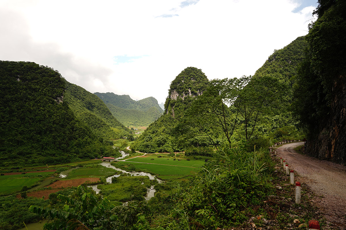 Rejoin the road towards the Phia Oac summit, reaching over 1300 m ASL. Take in the view of endless limestone ridges known as the Dragon’s Back, then descend switchbacks to a lively town. Enter a remote section with views over streams and waterfalls, leading to the charming valley town of Thong Nong for the night.