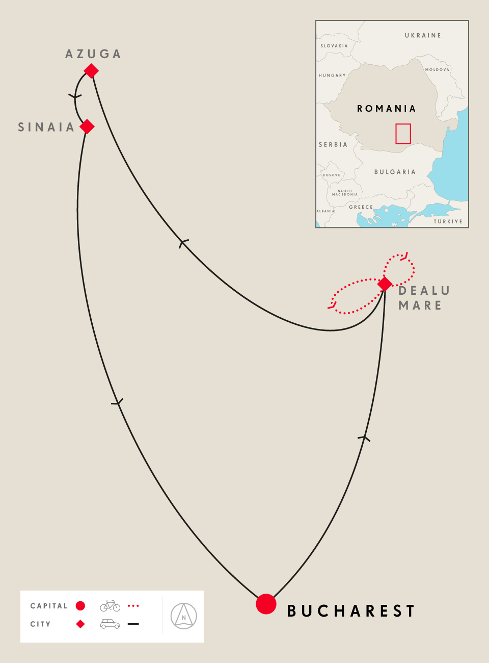 Set in the rolling hills of Dealu Mare, Romania’s most established wine region, the journey combines easy riding with behind-the-scenes access to boutique wineries and historic estates. Short routes along vineyard lanes and quiet village roads leave plenty of time for private tastings, guided cellar visits, and long lunches among the vines. The experience then shifts toward the mountains, following a historic route north to Sinaia, where Romania’s royal heritage comes into focus with a guided visit to Peleș Castle and Pelișor Castle. With thoughtfully paced rides, carefully chosen accommodations, and seamless transfers, the focus here is less on distance and more on depth, offering an elegant introduction to Romania’s wine country, royal heritage, and the landscapes that lead into Transylvania.